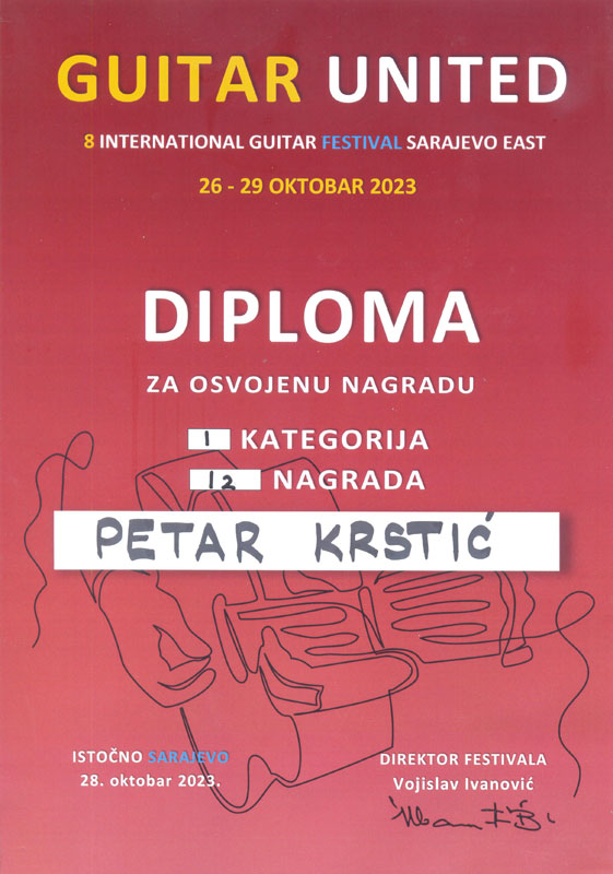 U Istočnom Sarajevu (Bosna i Hercegovina) 28. oktobra 2023. godine na Osmom međunarodnom festivalu gitare ”GuitArt Fest Sarajevo East“ nastupio je moj učenik Petar Krstić (2. razred). Stručni žiri mu je dodelilio 1. drugu nagradu (95,8 bodova).