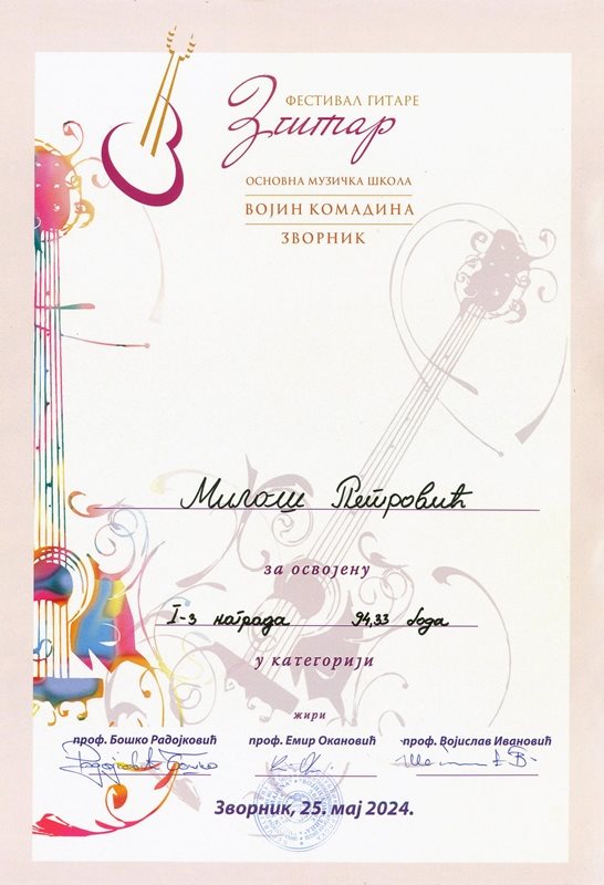 U subotu 25. maja 2024. godine moji učenici Dunja Jagodić (2. razred), Petar Krstić (2. razred) i Miloš Petrović (1. razred) su nastupili na Festivalu gitare Zgitar 2024 u Zvorniku (Bosna i Hercegovina). Stručni žiri (Vojislav Ivanović, Boško Radojković i Emir Okanović) im je dodelio prve nagrade: Petar Krstić (95,33 boda – lauret kategorije), Miloš Petrović (94,33 boda – 1. treća nagrada) i Dunja Jagodić (92,33 boda – 1. šesta nagrada).