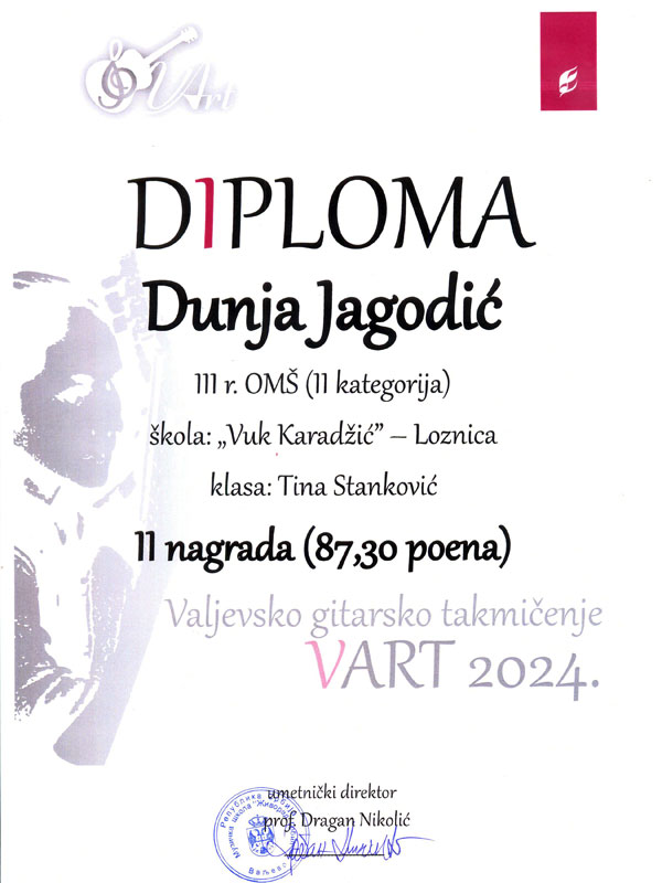 - Dunja Jagodić, druga nagrada (87,30), Valjevsko gitarsko takmičenje „VArt 2024“, Valjevo, 7. i 8. 12. 2024. (Srbija), 3. razred, Osnovna muzička škola „Vuk Karadžić“, Loznica (Izdvojeno odeljenje Ljubovija)