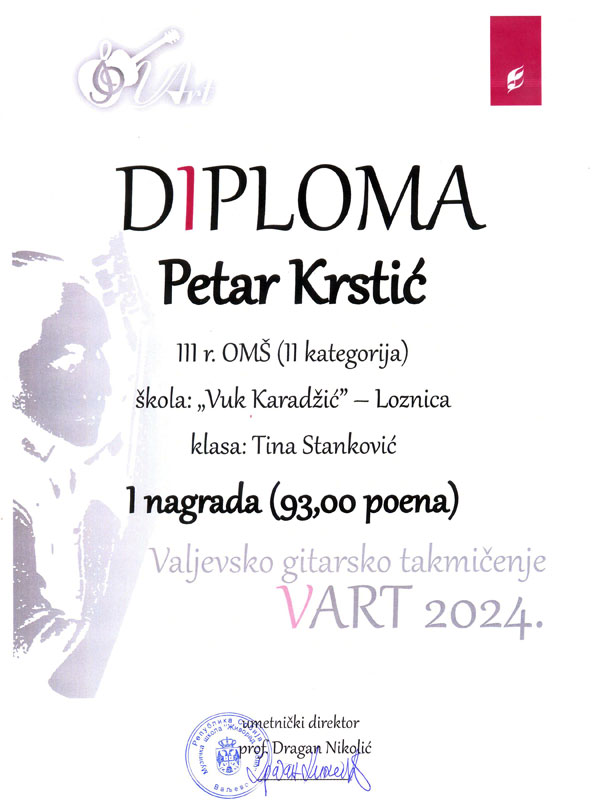- Petar Krstić, prva nagrada (93,00), Valjevsko gitarsko takmičenje „VArt 2024“, Valjevo, 7. i 8. 12. 2024. (Srbija), 3. razred, Osnovna muzička škola „Vuk Karadžić“, Loznica (Izdvojeno odeljenje Ljubovija)