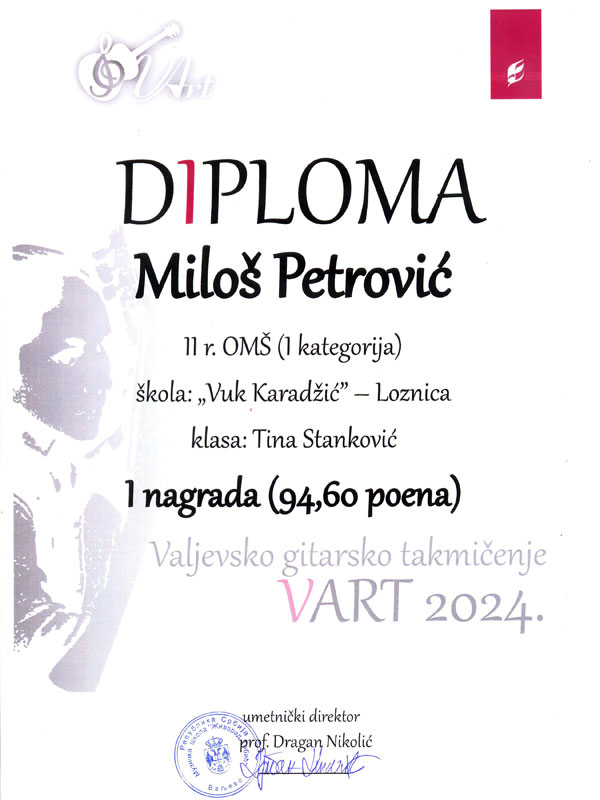 - Miloš Petrović, prva nagrada (94,60), Valjevsko gitarsko takmičenje „VArt 2024“, Valjevo, 7. i 8. 12. 2024. (Srbija), 2. razred, Osnovna muzička škola „Vuk Karadžić“, Loznica (Izdvojeno odeljenje Ljubovija)