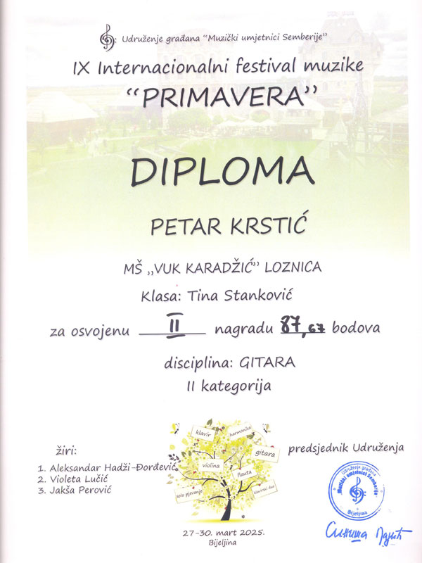 - Petar Krstić, druga nagrada (87,67), IX Internacionalni festival muzike „Primavera“, Bijeljina, 30. 03. 2025. (Bosna i Hercegovina), 3. razred, Osnovna muzička škola „Vuk Karadžić“, Loznica (Izdvojeno odeljenje Ljubovija)