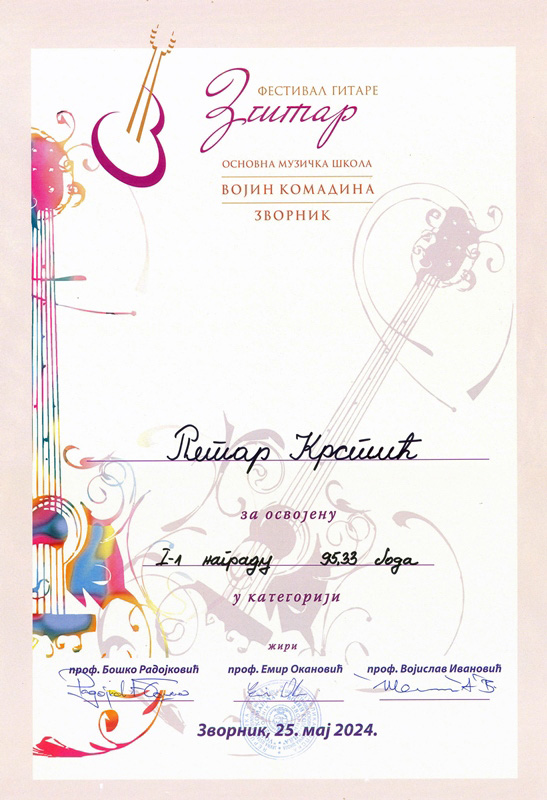 - Petar Krstić, prva nagrada (laureat kategorije – 95,33), Festival gitare Zgitar 2024, Zvornik (Bosna i Hercegovina) 25. 5. 2024. godina, 2. razred, Osnovna muzička škola „Vuk Karadžić“, Loznica (Izdvojeno odeljenje Ljubovija)
