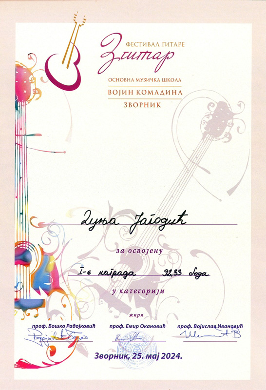 - Dunja Jagodić, prva nagrada (92,33), Festival gitare Zgitar 2024, Zvornik (Bosna i Hercegovina) 25. 5. 2024. godina, 2. razred, Osnovna muzička škola „Vuk Karadžić“, Loznica (Izdvojeno odeljenje Ljubovija)