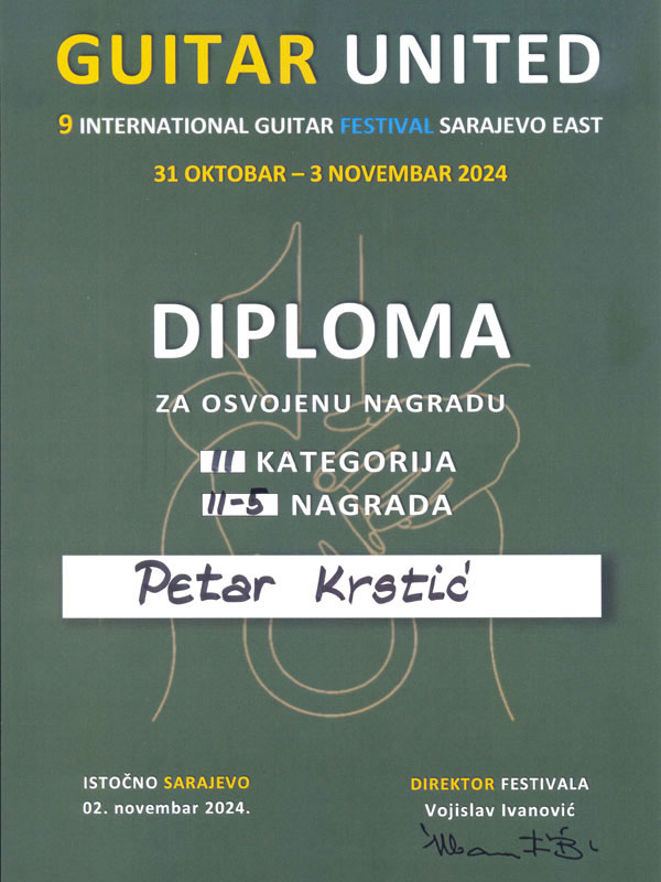 - Petar Krstić, druga nagrada (89), Deveti međunarodni festival gitare ”GuitArt Fest Sarajevo East“, Istočno Sarajevo, (Bosna i Hercegovina), 2. 11 2024. godina, 3. razred, Osnovna muzička škola „Vuk Karadžić“, Loznica (Izdvojeno odeljenje Ljubovija)