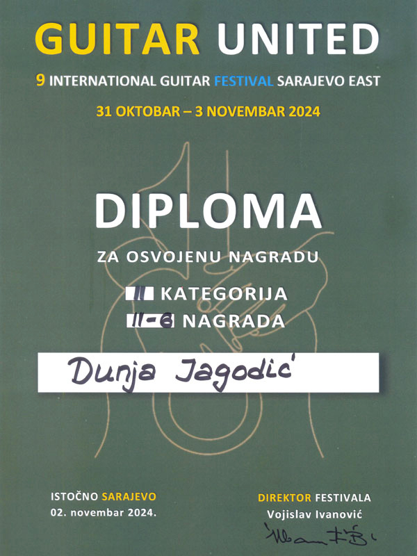 - Dunja Jagodić, druga nagrada (87,8), Deveti međunarodni festival gitare ”GuitArt Fest Sarajevo East“, Istočno Sarajevo, (Bosna i Hercegovina), 2. 11 2024. godina, 3. razred, Osnovna muzička škola „Vuk Karadžić“, Loznica (Izdvojeno odeljenje Ljubovija)